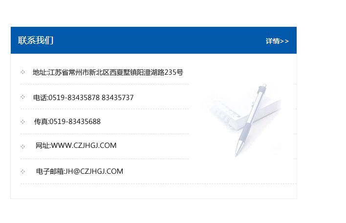 傳真:0519-83435688    郵編:213135    網址:WWW.czjhgj_com.i75wu.com    電子郵箱:JH@czjhgj_com.i75wu.com